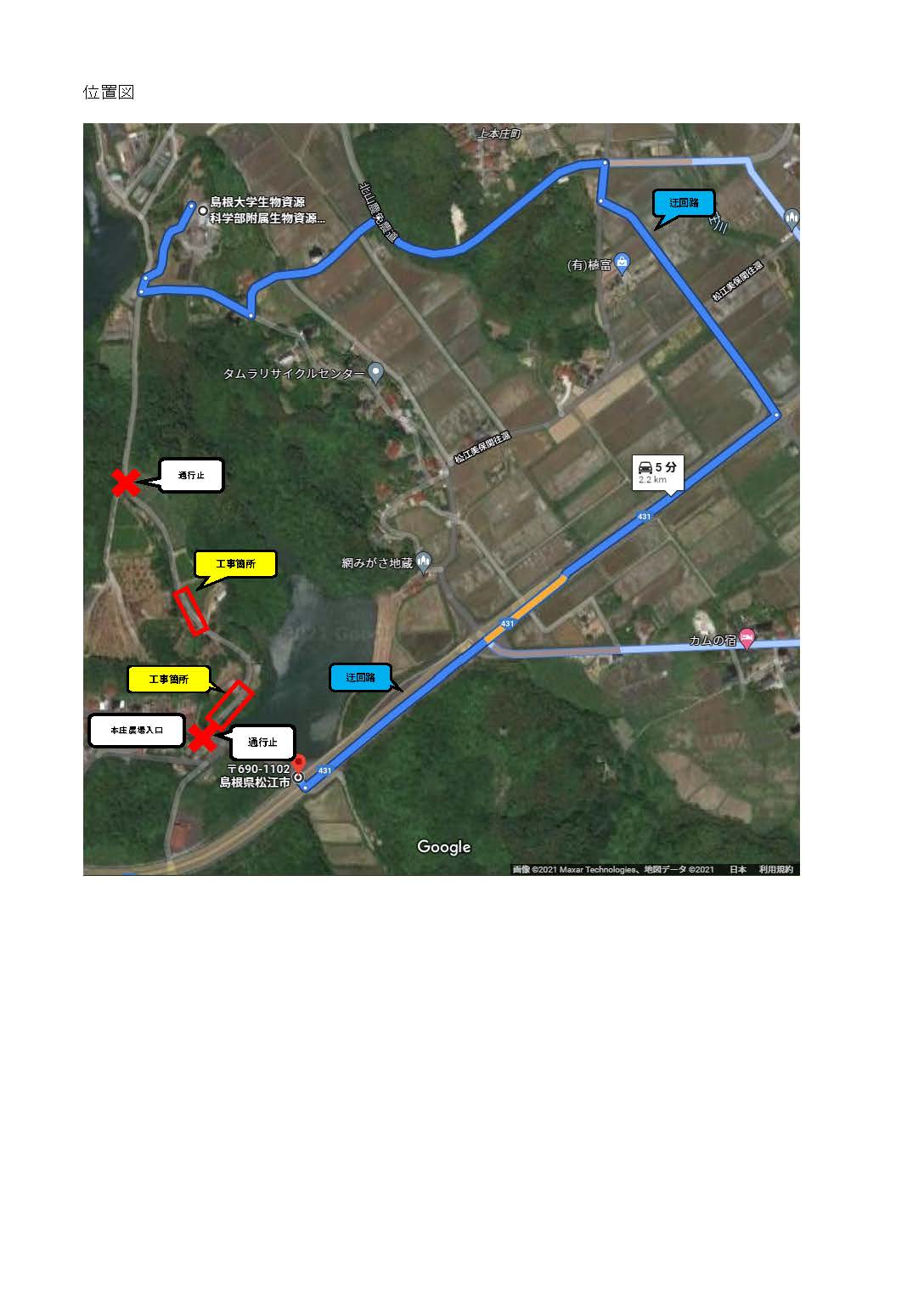備 考:本庄農場入口が通行止めのため,迂回路による通行をお願いいたします。