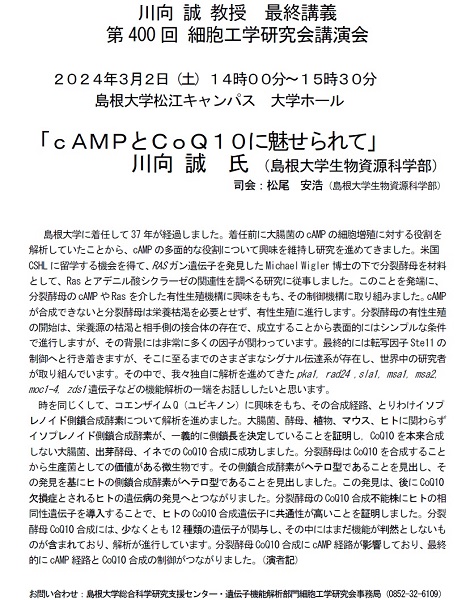生物資源科学部生命科学科の川向 誠教授の最終講義が細胞工学研究会と共催で2024年3月2日に開催されます。一般の方の聴講も可能ですので,皆様の参加をお待ちしています。
