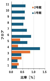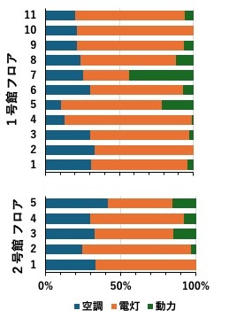 生物資源科学部の2024年度の電力消費は2023年度に比べ4%以上の省電力を達成しました。電力消費の内訳は、空調が26%、電灯が64%、動力が10%でした。生物資源科学部「1号館」、「2号館+大学院棟」の電気使用量について各建物のフロアごとの項目別割合を示します(図1)。1号館5階と7階、2号館3階と5階の動力用電気割合が高くなっています。1号館の2階と10階、2号館の1階ではそれぞれ動力用電気はほぼ0でした。2号館ではどのフロアも空調用電気の割合が25~40%と高い傾向にありました。床面積あたり年間電気使用量比率を図2に示しました。床面積100平方メートルあたりで消費する電気を年間電気使用量に占める比率として示しています。床面積あたり電気使用量の大きいフロアは1号館4階、1号館6階、2号館3階が上位3フロアになります。1号館の1階から3階と2号館の3階以外のフロアは比率が0.5%未満となっています。昨年の教員一人あたり消費電力でも示されていましたが、床面積あたり消費電力も1号館で高い数値になっています。今年の夏も厳しい暑さが予想されていますが、昨今の電気代の高騰もありますので、夏季に向けて上記(1)に示したような節電対策をお願いしたいと思います。