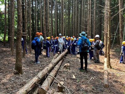 2025年7月1日に島根大学教育学部附属義務教育学校前期課程5年生の皆さんが宿泊研修の一環として、島根大学三瓶演習林で実習を行いました。まずは、「直径巻き尺」を使って、代表者が樹木(ヒノキ)の直径を測定しました。次に教職員手作りの「樹高測定器具」2種類を使って立ったままのその木の樹高を測定しました。その後その木を技術専門職員がチェーンソーで切り倒すのを見学しました。倒れた木の樹高を巻き尺で正確に測って、立った木の高さを正確に測れたかどうか確認しました。ピッタリの班もあり、数メートルの誤差が出た班もありました。暑い中でしたが、多くの児童が興味を持って活動に参加し、楽しく林内で活動できました。