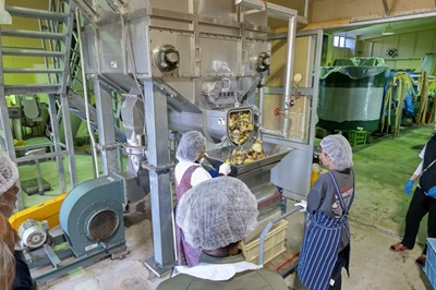 11月23日に富士酒造焼酎工場にて、生物資源科学部の専門教育科目「基礎フィールド演習」のフィールドワークおよび鳥取大学大学院連合農学研究科・横断的研究プロジェクト「酒類産業発展のための発酵学・栽培学・酒育の融合」の一環として島根大学芋焼酎「神在の里」の仕込み体験を行いました。2007年より学生が焼酎仕込み体験を行うことになり、コロナ禍の影響で中断した年もありながら、今回で16回目の仕込み体験となりました。当日は富士酒造合資会社の今岡一朗代表をはじめ社員の皆様の御協力もあり、1トンのサツマイモを切除作業、蒸した芋の粉砕作業、粉砕した芋の発酵タンクへの運搬作業を体験しました。また、今岡代表より酒類による製造方法の違いや焼酎造りの特徴、富士酒造で焼酎造りを始めた経緯などについて説明をしていただきました。早朝から始まる重労働なフィールドワークではありましたが、無事に終了しました。参加した学生からは「焼酎を造る人の大変さや凄さを感じた」、「アルコールができる理屈は理解しているが実際に見ると不思議に感じた」、「今回の経験を経て、お酒に関する理解が深まり、普段の飲酒もさらに味わい深いものになったように感じる」との感想がありました。本科目のフィールドワークでは9月下旬に神西砂丘農場で焼酎原料となるサツマイモの収穫作業も行っており、学生にとっては体験しないとわからないものを感じることができた有意義な機会になったと思います。